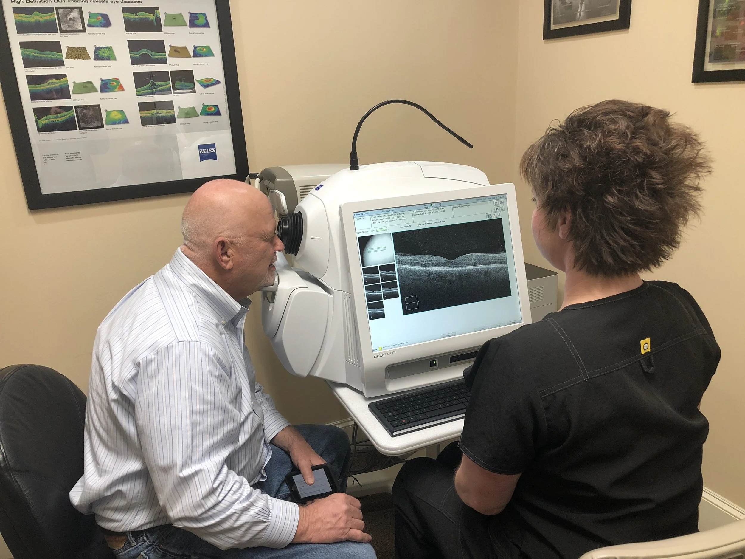 OCT has emerged as the standard of care in diagnosing ocular manifestations of disease such as Age Related Macular Degeneration (AMD), Glaucoma, migraines, Diabetes, retina and optic nerve disorders, etc. This technology gives us a 3D MRI-type image of the retina to allow access to the retina and optic nerve that we previously could not view. This allows for earlier and thorough treatment strategies.