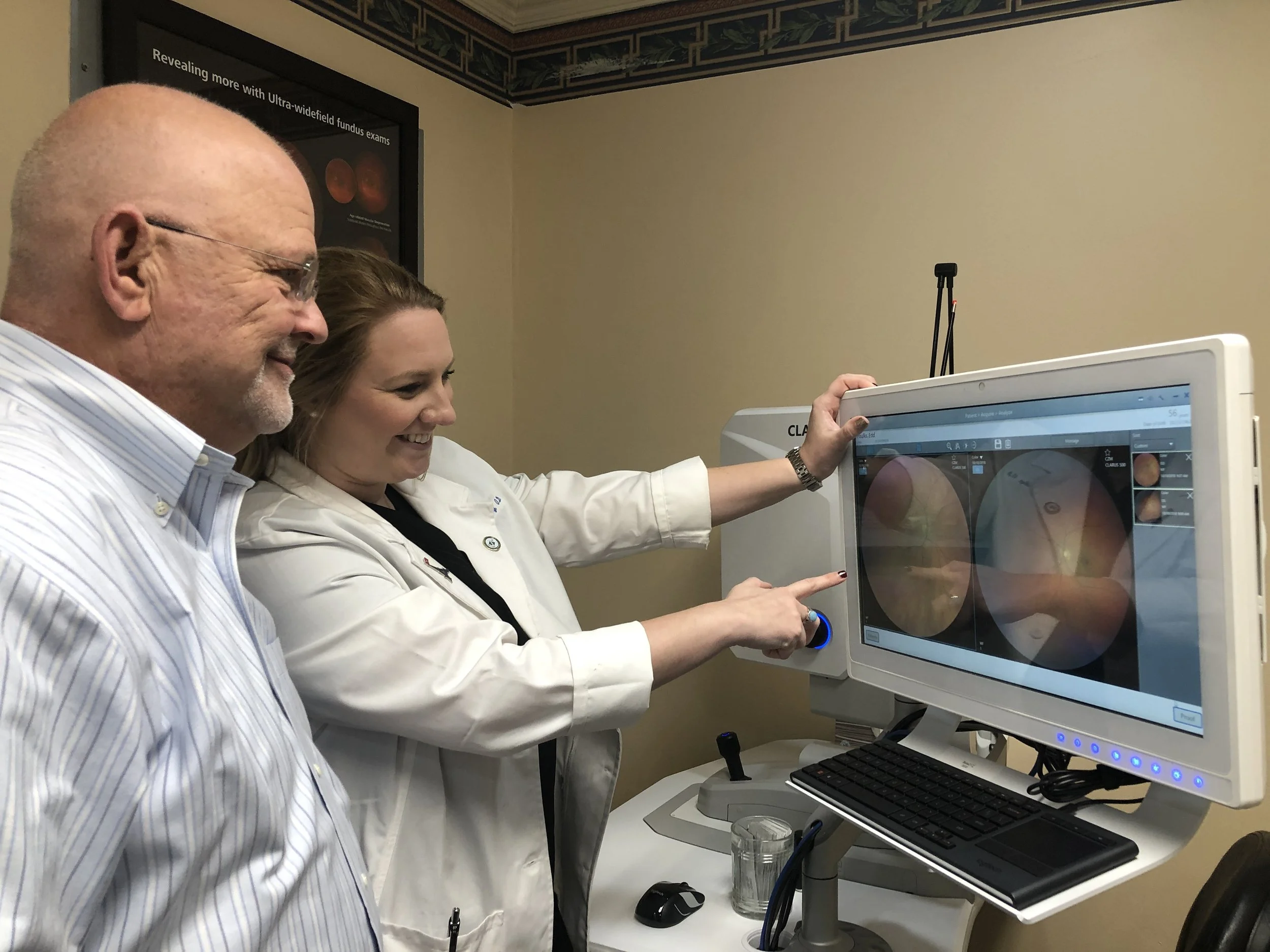 • The Clarus Retinal Exam is fast, easy and comfortable for all ages. To have the exam, you simply look into the device one eye at a time and you will see a comfortable flash of light to let you know the image of your retina has been taken. The photo is then pulled on the screen so that the doctor and the patient can view together.